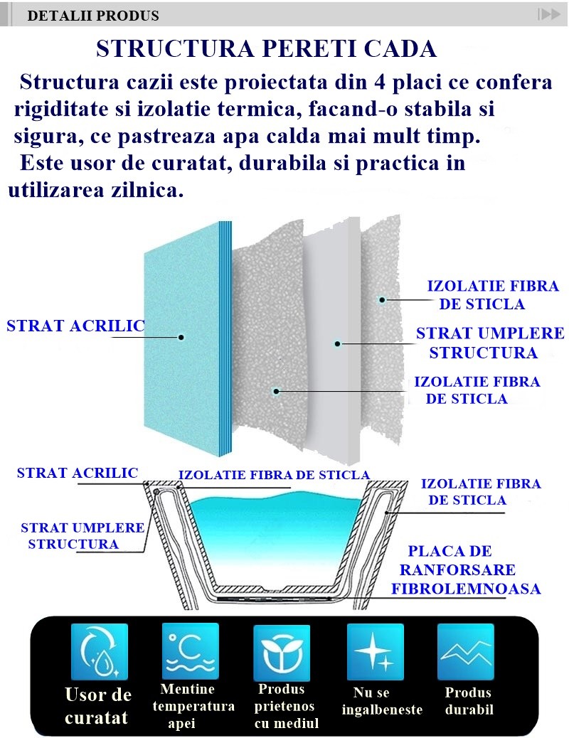- Cazile sunt fabricate din acril – partea care se vede (placa de 4 mm) plus fibra de sticla – partea de dedesubt, fibra de sticla este cea care ranforseaza cada, ii ofera rigiditate si durabiltate la utilizarea in timp.