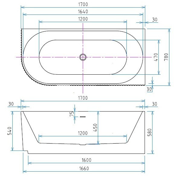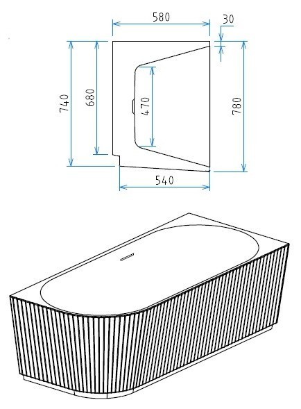 Cada freestanding lipita la perete, de colt, cu dimensiuni de 170x78 cm, montaj pe pardoseala (pe partea dreapta), model Parma. Aceasta este fabricata din acril sanitar premium, culoare alb. O cada freestanding ideala pentru o baie cu un design elegant.