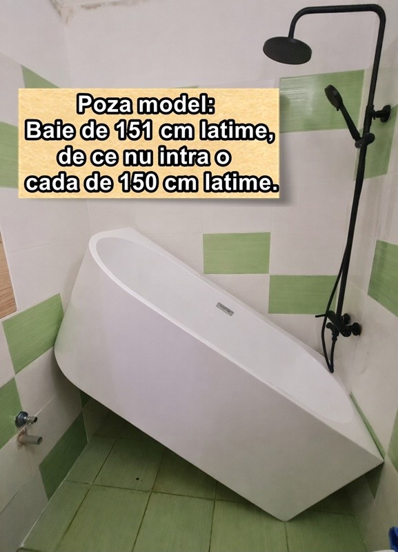 - Dimensiuni – 170 x 78 x 58 cm --- FOARTE IMPORTANT - la aceasta cada daca montajul ei se va face intre trei pereti, locul disponibil trebuie sa fie de minim 176 cm, altfel cada nu se va putea monta pe pozitie, fizic nu ai cum sa o lasi pe pozitie, cada cand se monteaza descrie o diagonala intre coltul de sus si coltul opus de jos, diagonala respectiva are 176 cm. Daca aveti intrebari va raspund cu placere 0765252137. Vezi si schita, e ultima dupa fotografii.